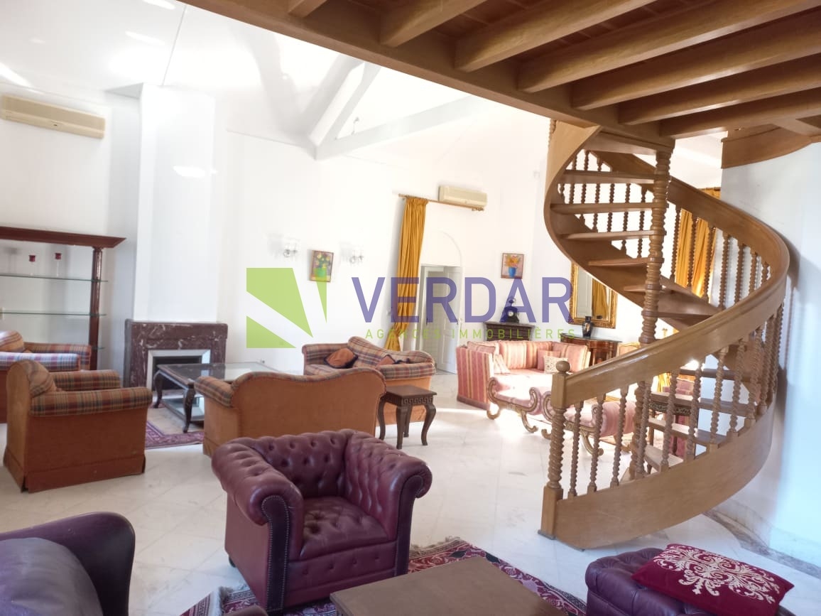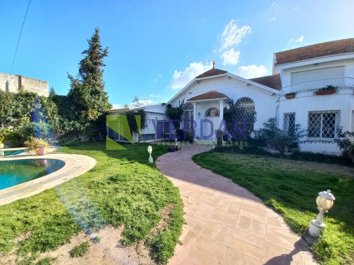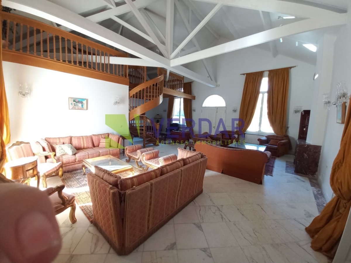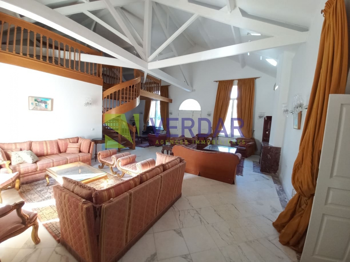 Cette propriété allie charme et confort. Elle est située d’un quartier calme et résidentiel au cœur de Megrine Coteau. Elle est caractérisée par son style coloniale. Le jardin paysagé offre un véritable espace de détente valorisé par une piscine. L’entrée donne sur un double salon avec deux cheminée et un séjour qui constituent l'espace de réception. La partie jour est composée d’une cuisine entièrement équipée et aménagée, une salle d'eau pour les invités, une salle à manger et un deuxième séjour donne sur la piscine. Le compartiment nuit est composé de deux suites chacune est avec sa propre salle de bain et une chambre à coucher avec salle de douche à l’extérieure. A l’étage on trouve le compartiment parent qui offre une chambre à coucher donnant sur un balcon avec chambre de dressing et une salle de bain. Un studio pour le gardien est également disponible. Un abri pour trois voitures disponible pour les futurs habitants.