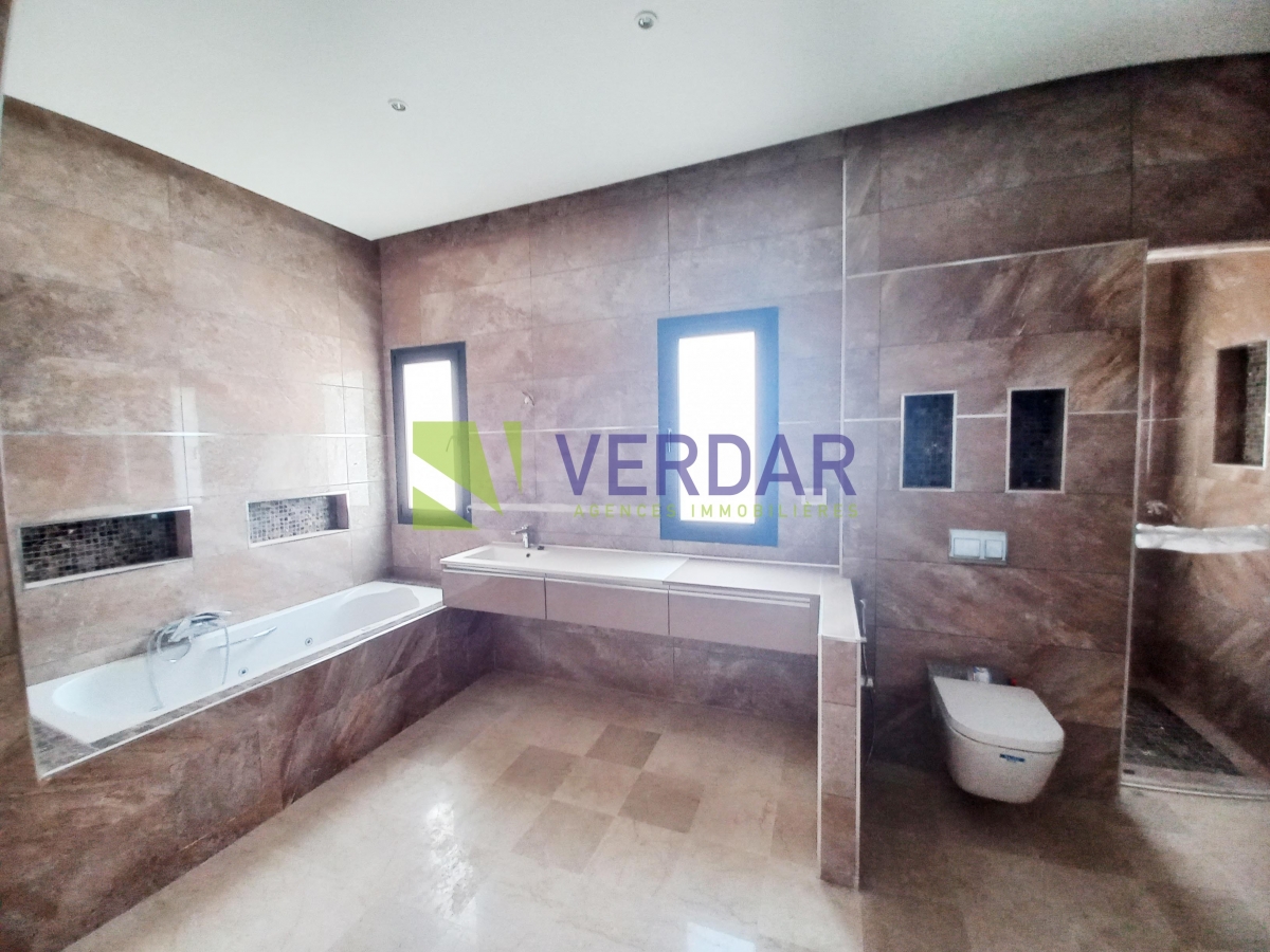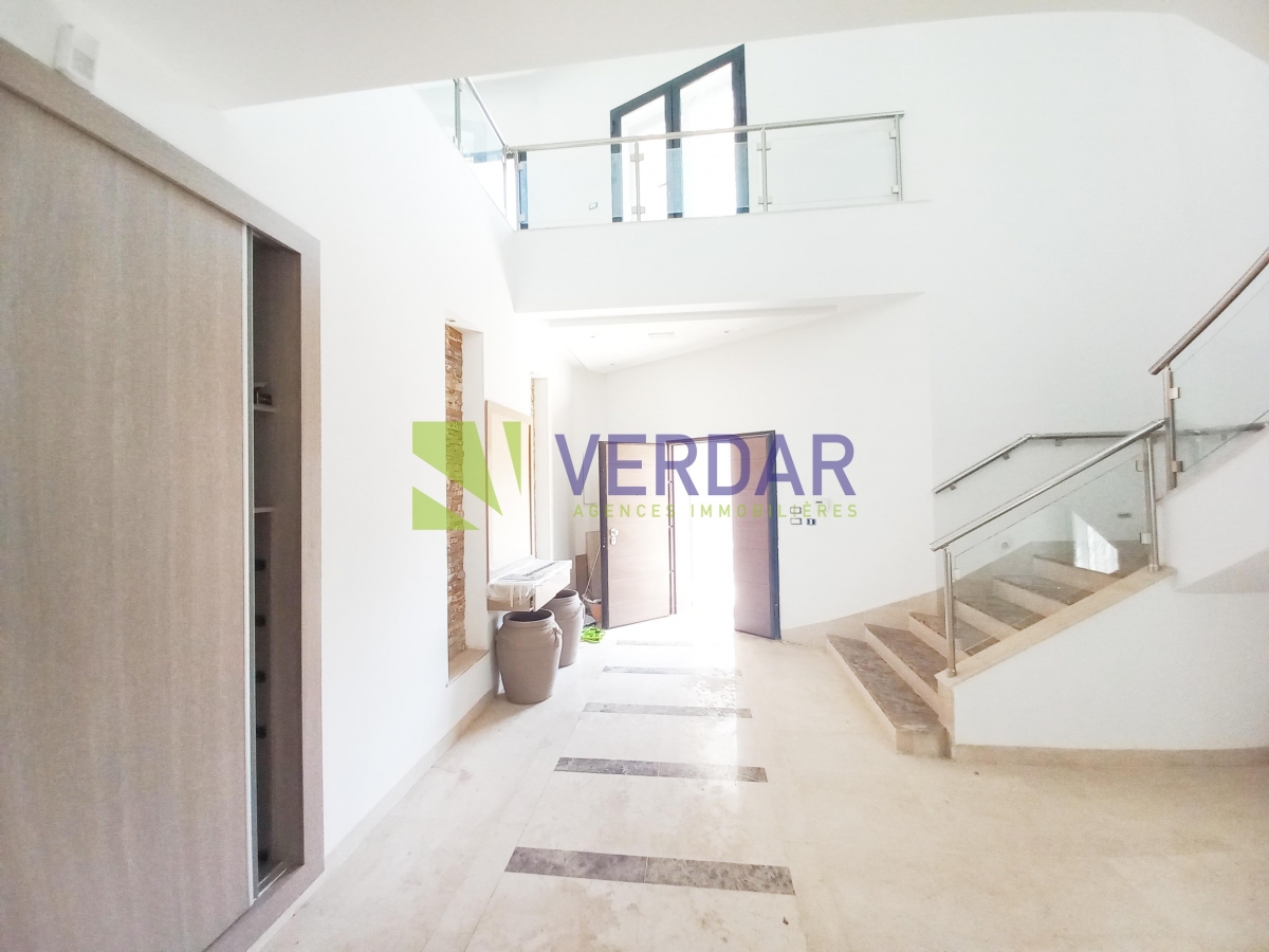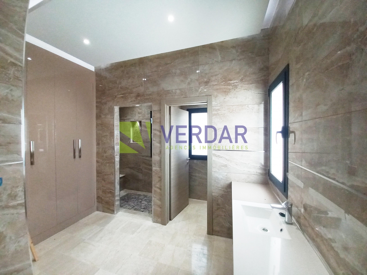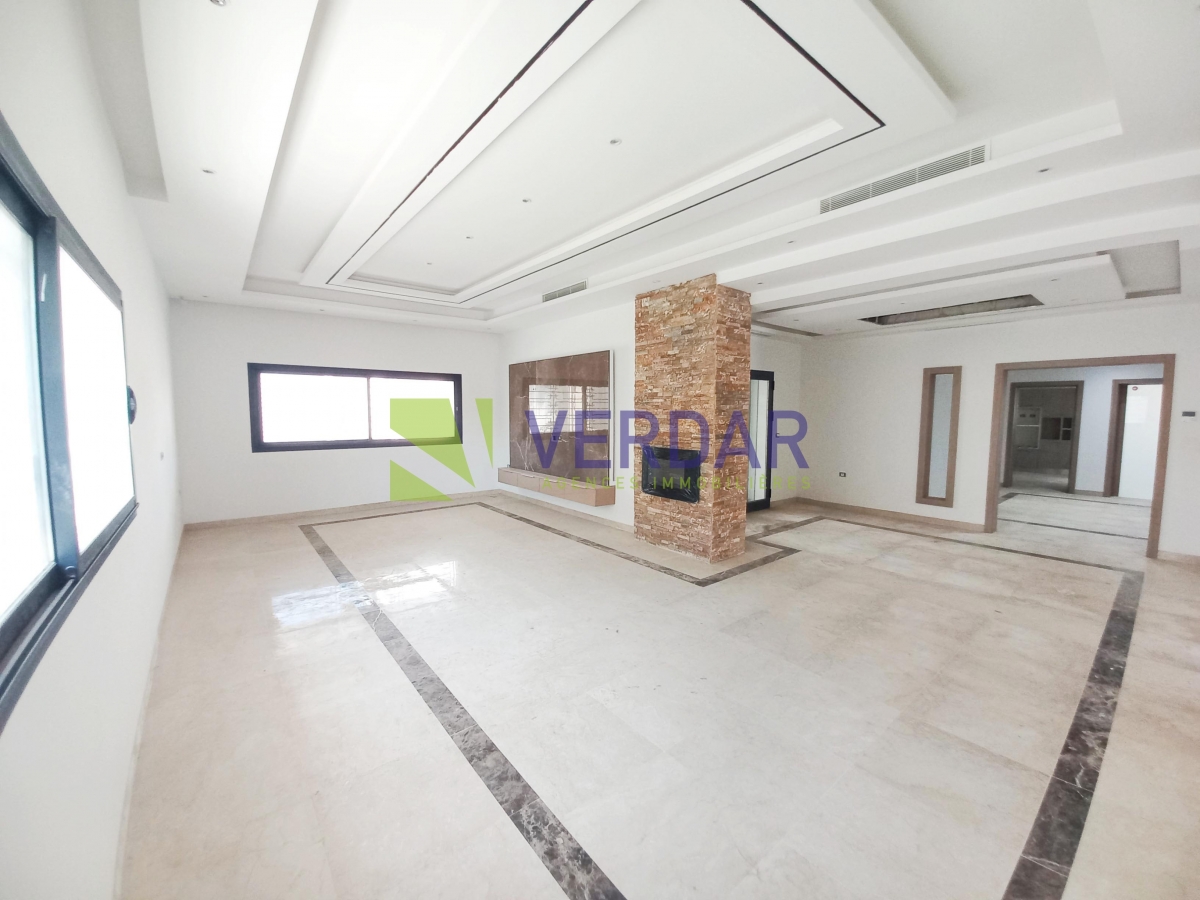 Cette villa est située dans un quartier calme et résidentiel, érigée sur deux niveaux sur un terrain de 840m². L'entrée donne sur un hall qui dessert le salon, cet espace est caractérisé par son volume généreux qui permet d'aménager deux salons et une salle à manger. La cuisine est aménagée de rangements pratiques et fonctionnels, elle donne sur une deuxième cuisine et une salle à manger. Cet étage est complété par un séjour, une cuisine externe et une salle d’eau pour les invités. Au premier étage, on découvre trois suites dont une avec sa chambre de dressing et sa propre salle de douche et deux suites avec salle de douche, deux chambres à coucher et une salle de bain commune sont disponibles. Le rez-de-jardin se compose d’une salle d’eau, une chambre de gardien, une espèce peut être utilisée comme salle de sport et un débarrât qui donne accès à l’espace extérieur où on trouve un garage qui abrite trois voitures. Cette propriété est équipé d’un chauffage central, système d’alarme, des caméras de surveillance et climatisation centrale.