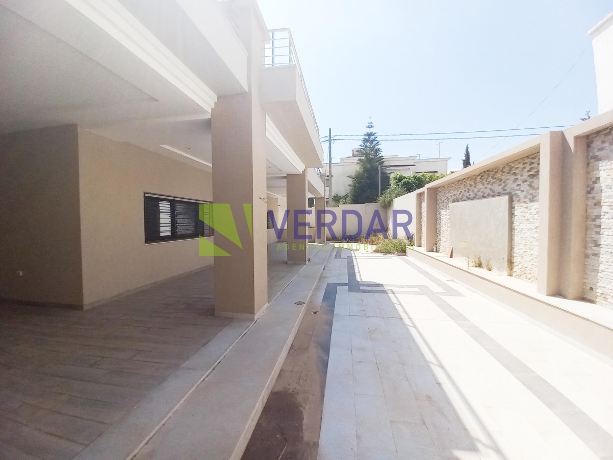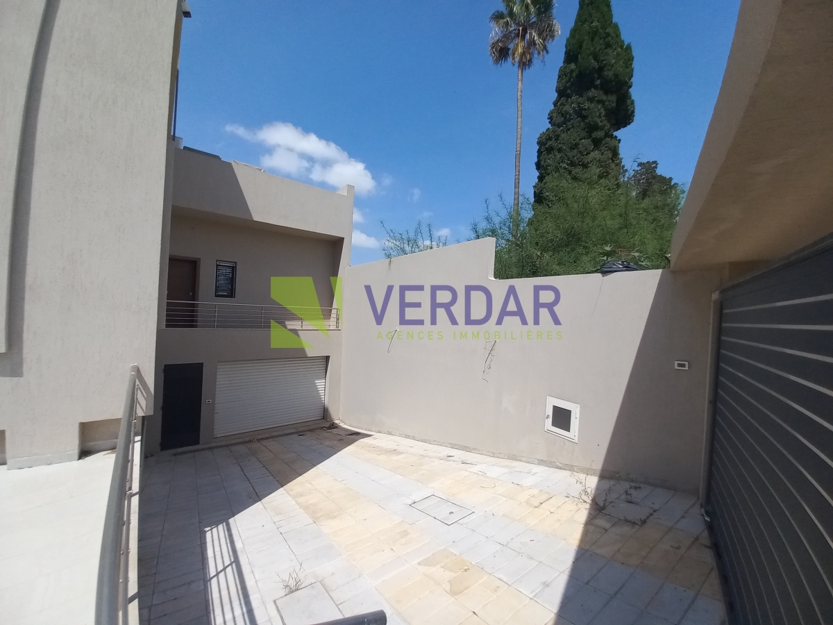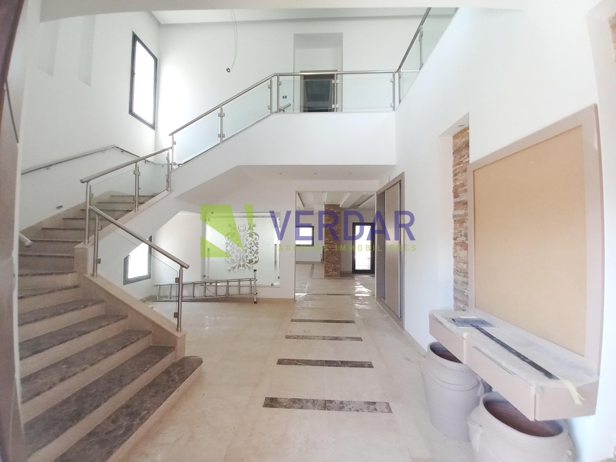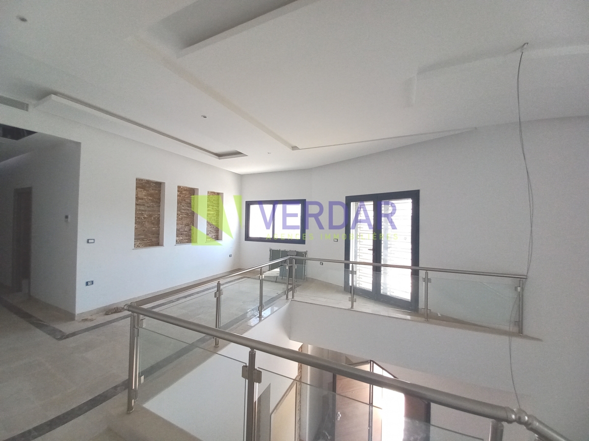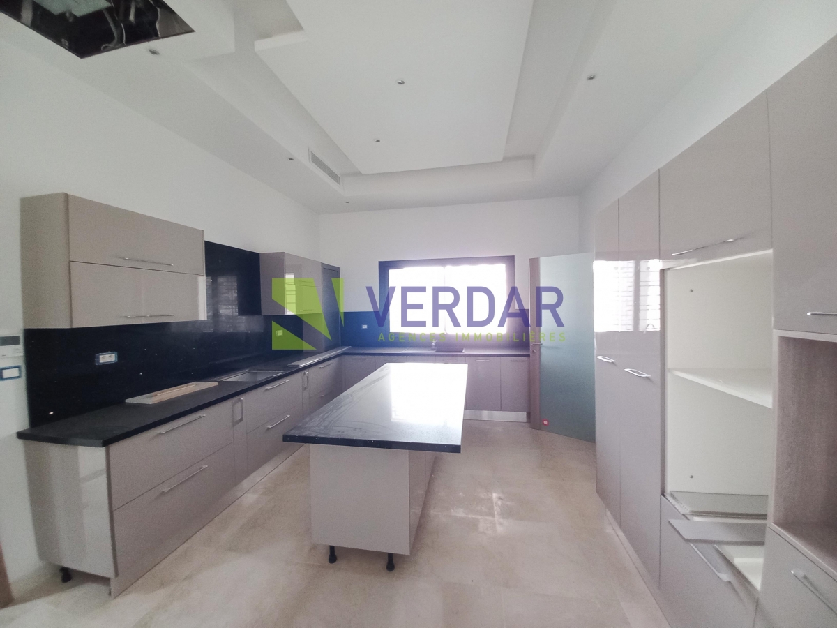Cette villa est située dans un quartier calme et résidentiel, érigée sur deux niveaux sur un terrain de 840m². L'entrée donne sur un hall qui dessert le salon, cet espace est caractérisé par son volume généreux qui permet d'aménager deux salons et une salle à manger. La cuisine est aménagée de rangements pratiques et fonctionnels, elle donne sur une deuxième cuisine et une salle à manger. Cet étage est complété par un séjour, une cuisine externe et une salle d’eau pour les invités. Au premier étage, on découvre trois suites dont une avec sa chambre de dressing et sa propre salle de douche et deux suites avec salle de douche, deux chambres à coucher et une salle de bain commune sont disponibles. Le rez-de-jardin se compose d’une salle d’eau, une chambre de gardien, une espèce peut être utilisée comme salle de sport et un débarrât qui donne accès à l’espace extérieur où on trouve un garage qui abrite trois voitures. Cette propriété est équipé d’un chauffage central, système d’alarme, des caméras de surveillance et climatisation centrale.