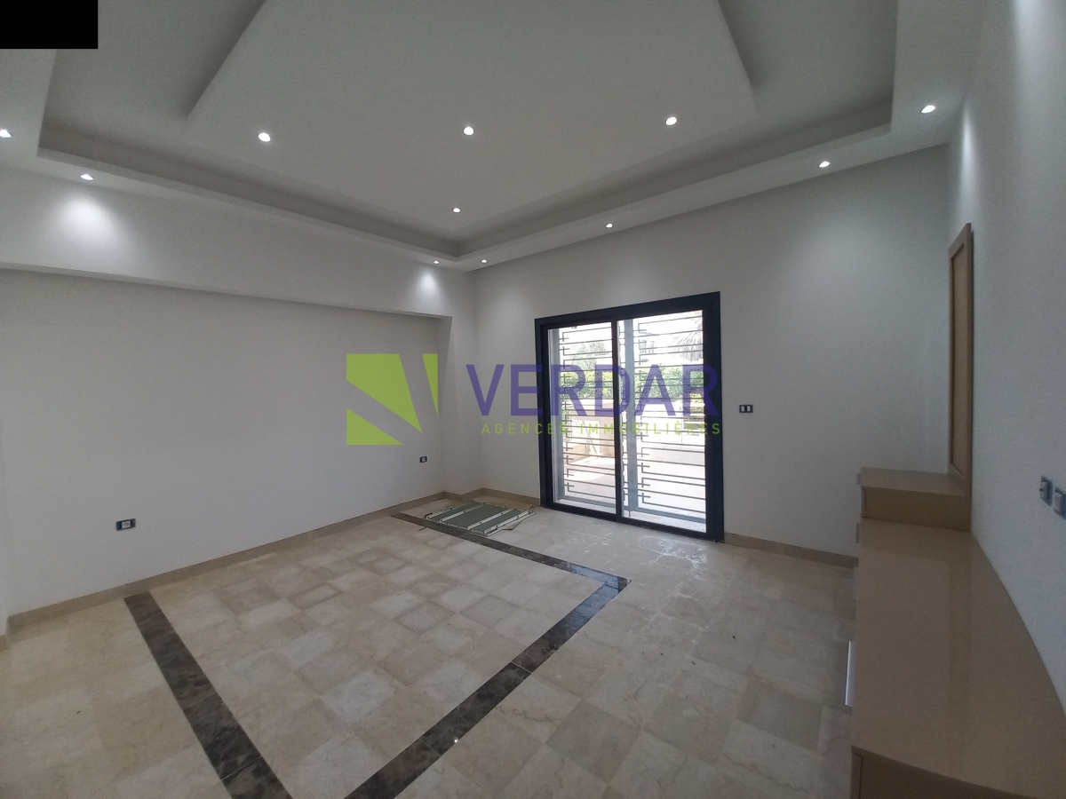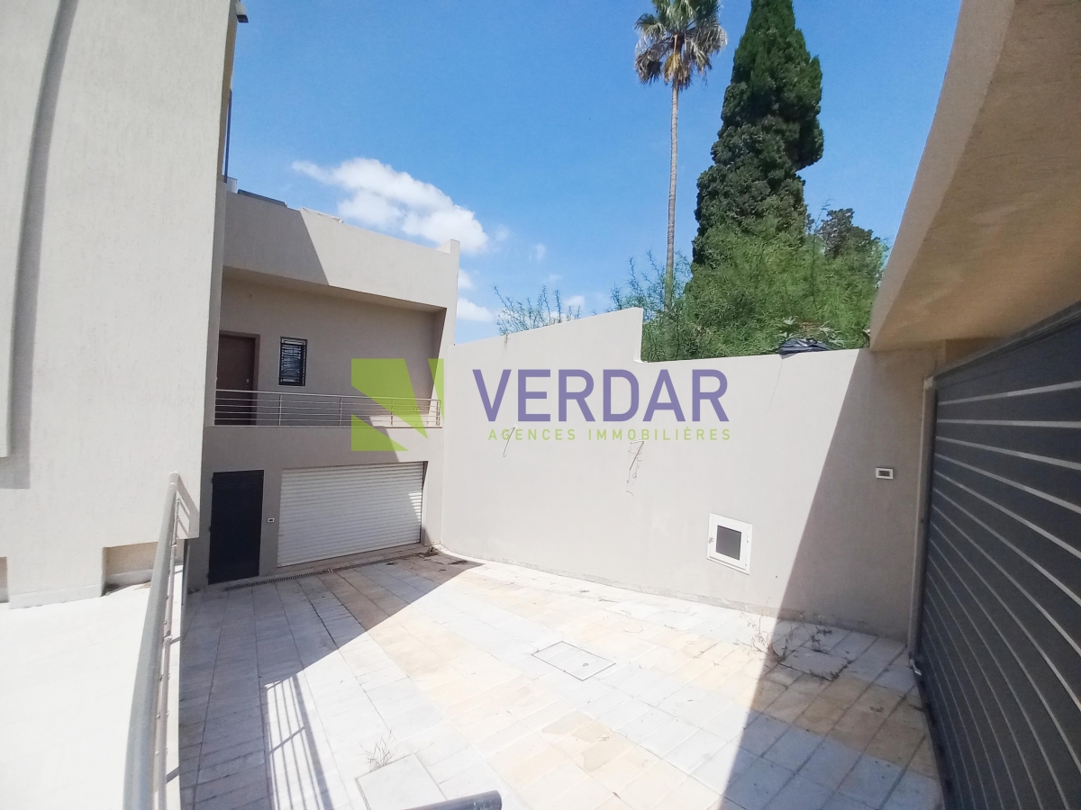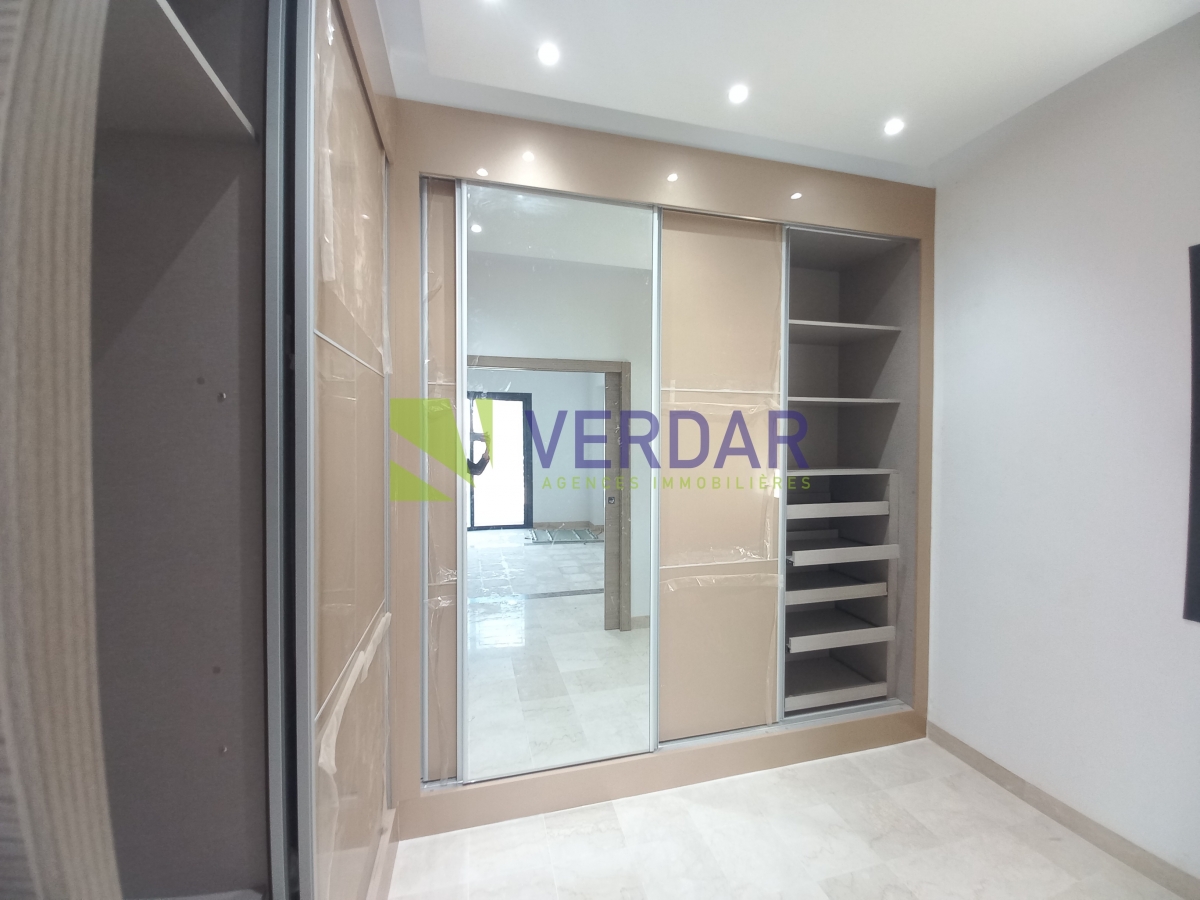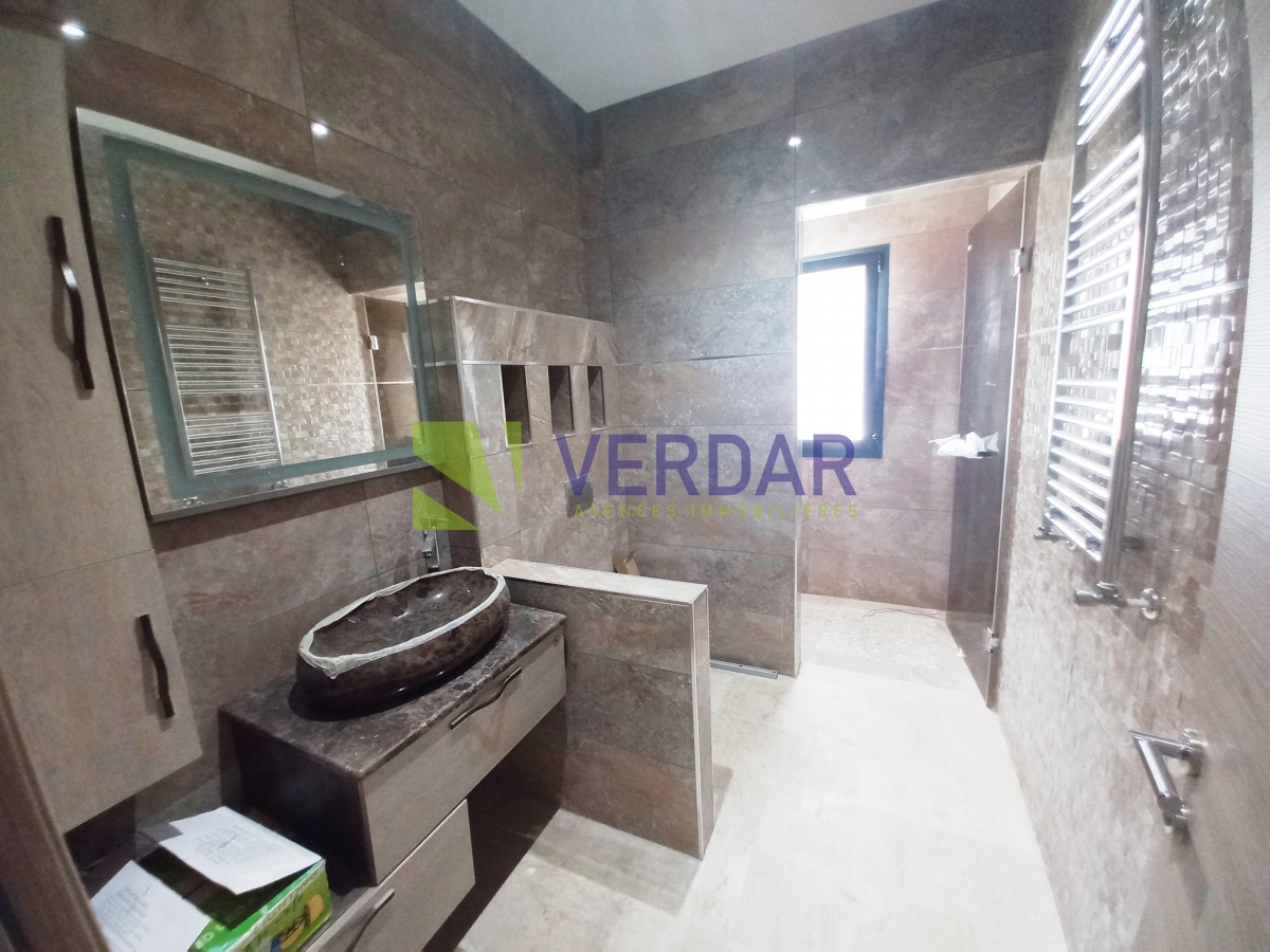 Cette villa est située dans un quartier calme et résidentiel, érigée sur deux niveaux sur un terrain de 840m². L'entrée donne sur un hall qui dessert le salon, cet espace est caractérisé par son volume généreux qui permet d'aménager deux salons et une salle à manger. La cuisine est aménagée de rangements pratiques et fonctionnels, elle donne sur une deuxième cuisine et une salle à manger. Cet étage est complété par un séjour, une cuisine externe et une salle d’eau pour les invités. Au premier étage, on découvre trois suites dont une avec sa chambre de dressing et sa propre salle de douche et deux suites avec salle de douche, deux chambres à coucher et une salle de bain commune sont disponibles. Le rez-de-jardin se compose d’une salle d’eau, une chambre de gardien, une espèce peut être utilisée comme salle de sport et un débarrât qui donne accès à l’espace extérieur où on trouve un garage qui abrite trois voitures. Cette propriété est équipé d’un chauffage central, système d’alarme, des caméras de surveillance et climatisation centrale.