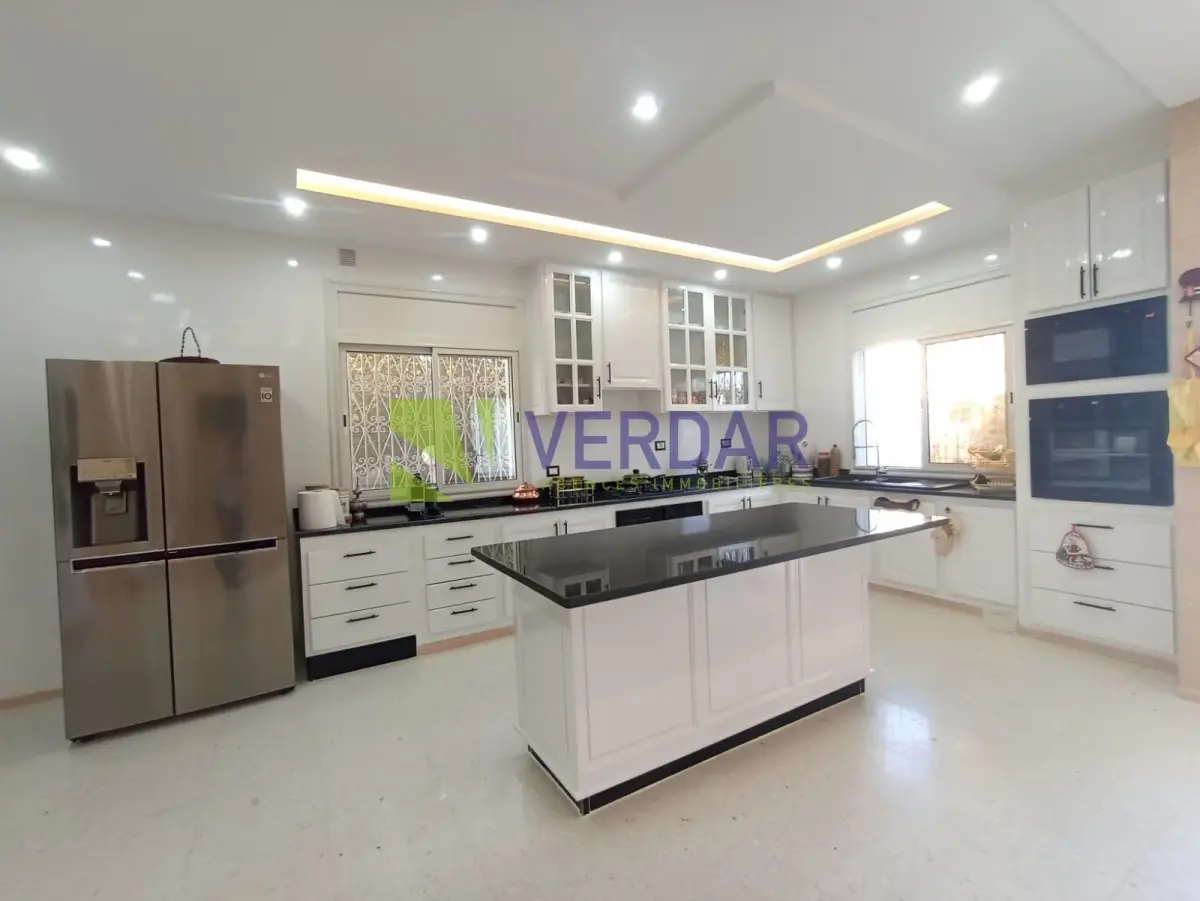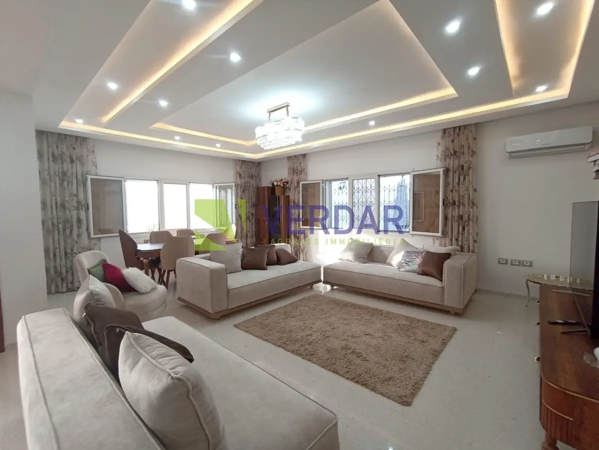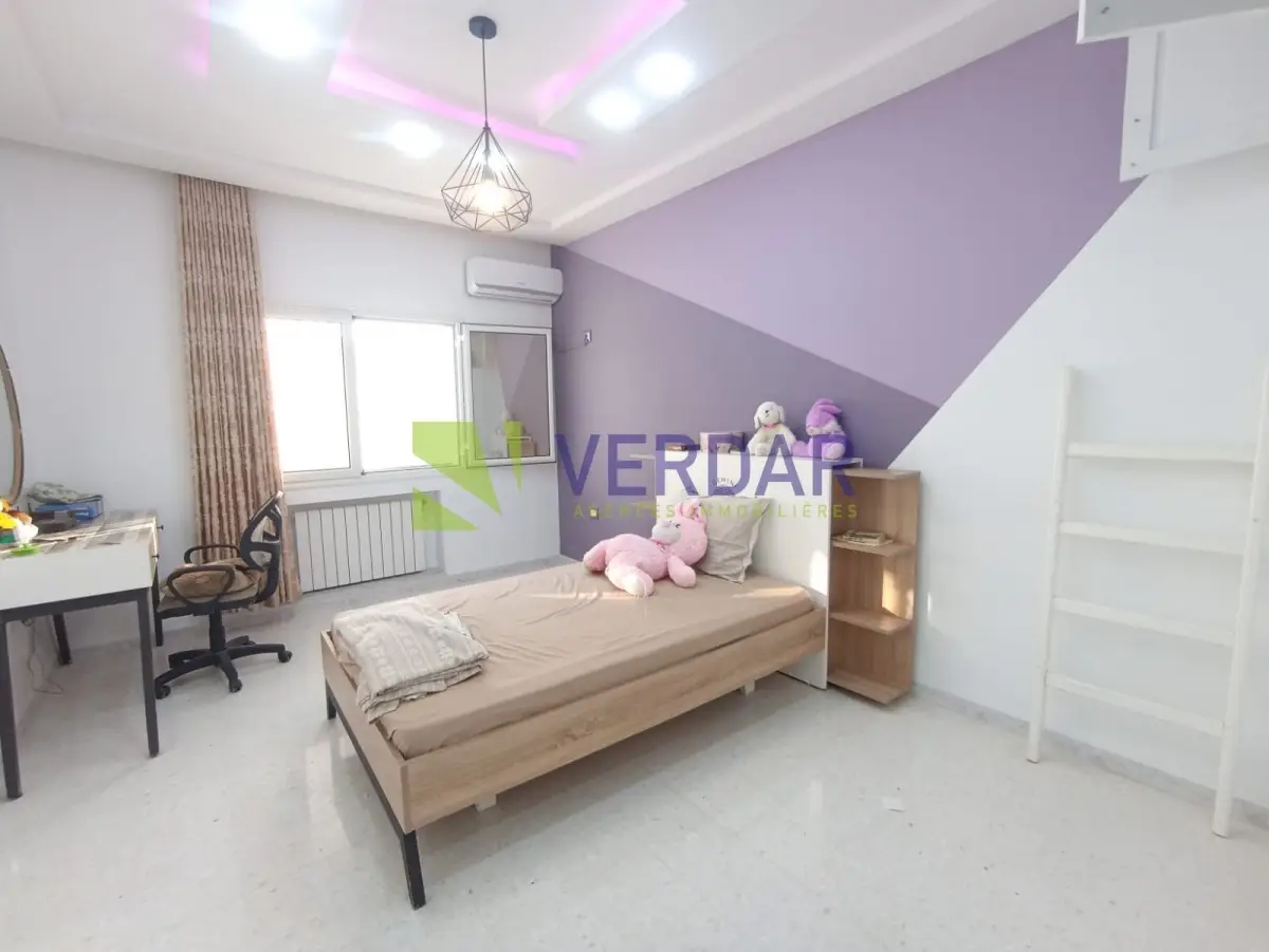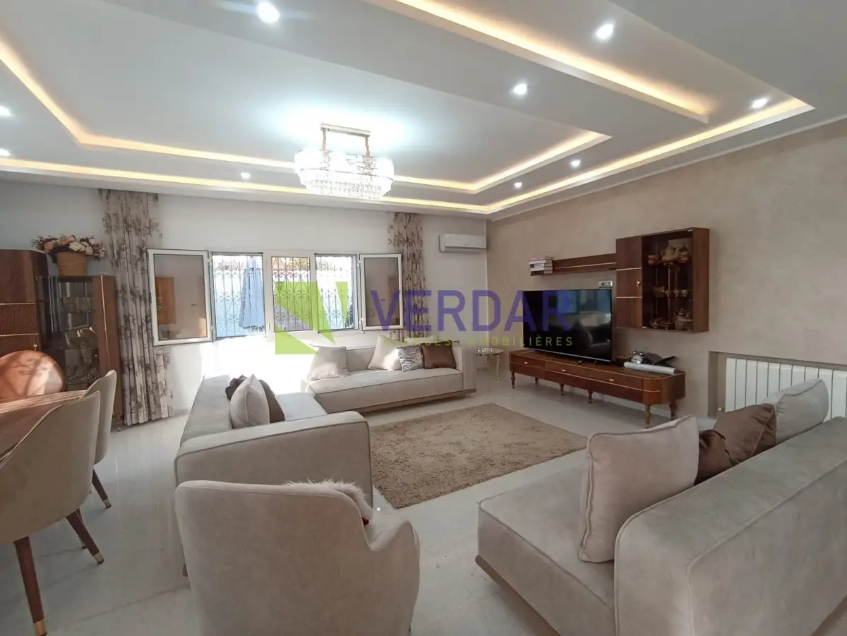 Une Villa S+4 de 220 m² sur un terrain de 578m² est situé dans un quartier calme et sélectionné doté d'un bon voisinage à Mornag. Elle est entourée par un jardin et une grande terrasse. L’entrée donne sur un salon spacieux. La cuisine est bien équipée avec un ilot central, elle donne accès à un séchoir. La Partie nuit abrite quatre chambres à coucher et une salle de bain. Cette villa est complétée par un studio. La climatisation en split système et le chauffage central sont disponibles. un abri de voiture mis à votre disposition.