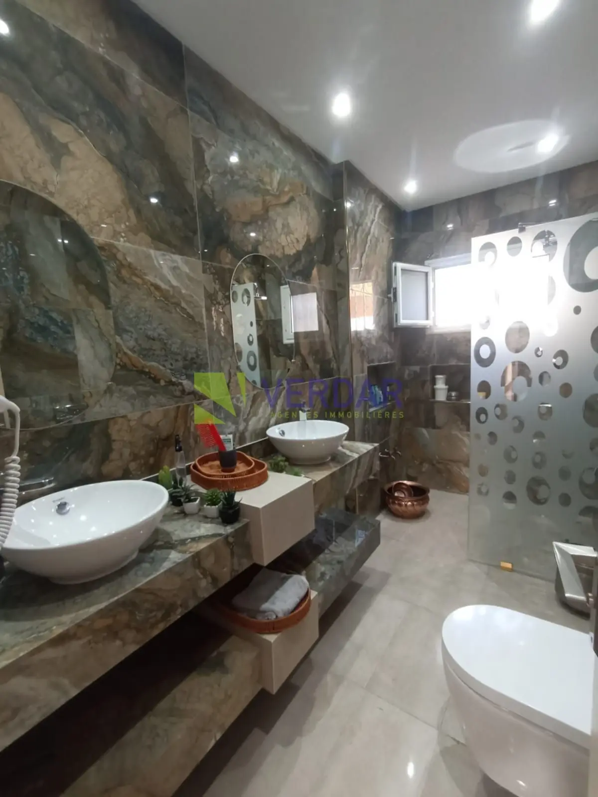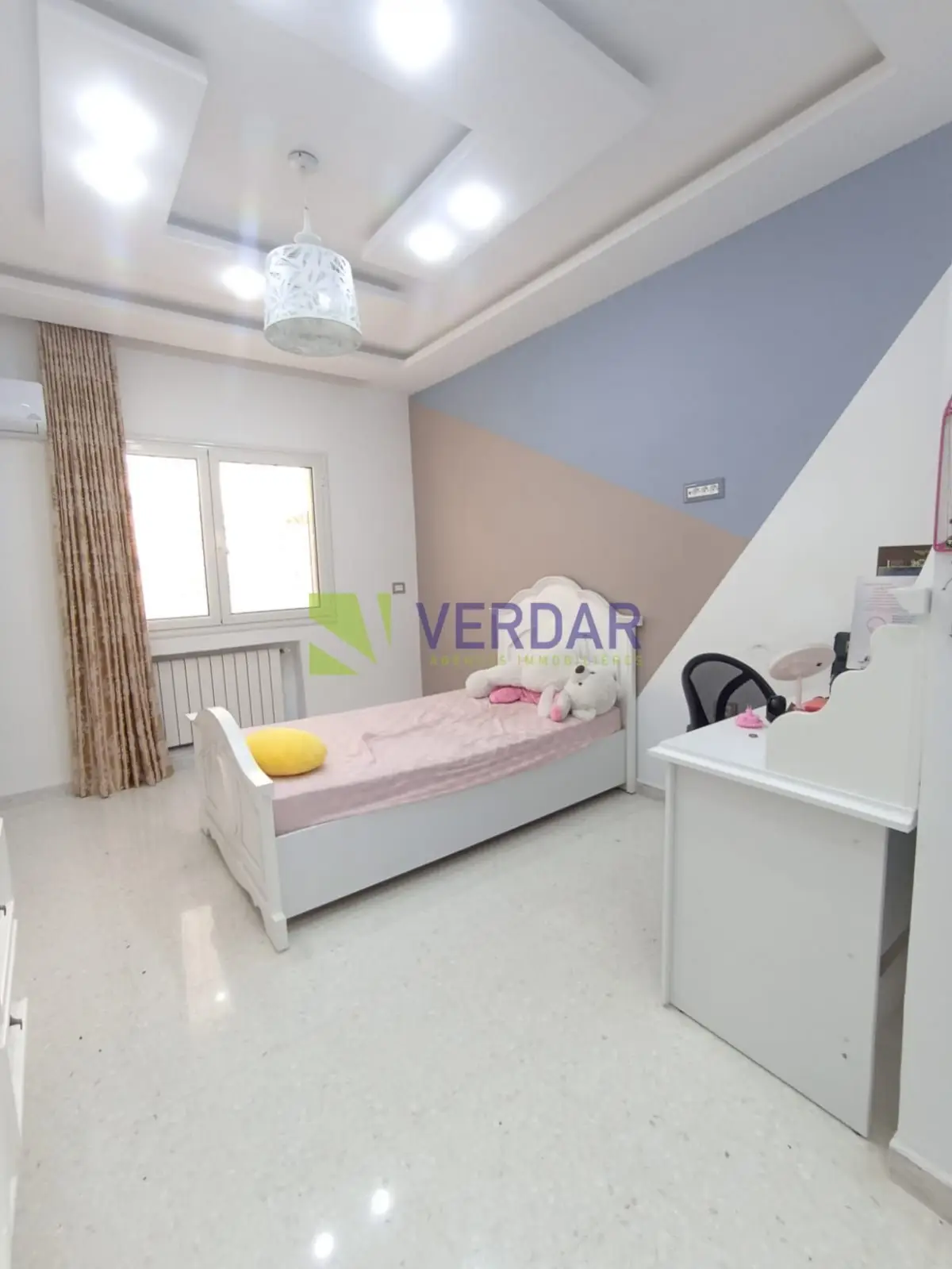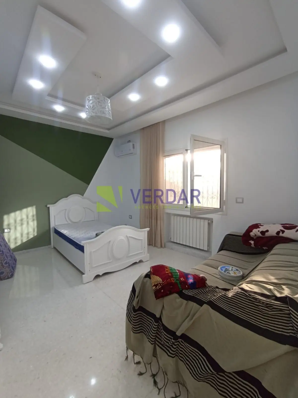 Une Villa S+4 de 220 m² sur un terrain de 578m² est situé dans un quartier calme et sélectionné doté d'un bon voisinage à Mornag. Elle est entourée par un jardin et une grande terrasse. L’entrée donne sur un salon spacieux. La cuisine est bien équipée avec un ilot central, elle donne accès à un séchoir. La Partie nuit abrite quatre chambres à coucher et une salle de bain. Cette villa est complétée par un studio. La climatisation en split système et le chauffage central sont disponibles. un abri de voiture mis à votre disposition.
